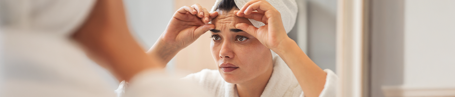 Stirnfalten sind ein Anzeichen des natürlichen Hautalterungsprozesses. Sie entstehen durch eine Kombination aus inneren und äusseren Faktoren und vertiefen sich im Laufe der Zeit. Die Hauptursache von Falten auf der Stirn ist eine ausgeprägte Mimik, deshalb werden sie auch Mimikfalten bzw. dynamische Falten genannt.1,2 Durch die Anspannung der Muskeln im Gesicht – vor allem beim Stirnrunzeln – bilden sich Linien in der Haut. Mit zunehmendem Alter geht die Kollagenproduktion der Haut zurück, wodurch die Festigkeit der Haut sinkt und Falten tiefer erscheinen können. Zusätzlich geht die hauteigene Hyaluronproduktion zurück und bestehendes Hyaluron wird abgebaut. Dadurch können Rillen, die durch Mimik entstehen, nicht mehr von selbst aufgefüllt werden. Als Folge können sich neue Stirnfalten bilden und bereits bestehende vertiefen.