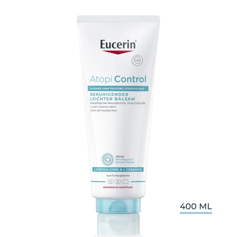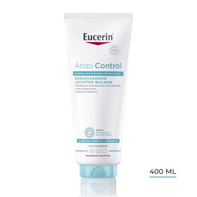 Eucerin® AtopiControl beruhigender Balsam ist ein Körperbalsam für die tägliche Anwendung, der speziell entwickelt wurde, um sehr trockene, gereizte und zu Juckreiz neigende Haut zu beruhigen und intensiv mit Feuchtigkeit zu versorgen. Dieser leichte, aber pflegende Öl-in-Wasser-Balsam ist mit beruhigendem Licochalcone A, Ceramiden und Sheabutter angereichert, um die Hautbarriere zu stärken und Trockenheit und Juckreiz zu lindern*. Er versorgt die Haut sofort mit Feuchtigkeit und macht sie weich und glatt, und bei regelmässiger Anwendung verbessert sich der Hautzustand deutlich.