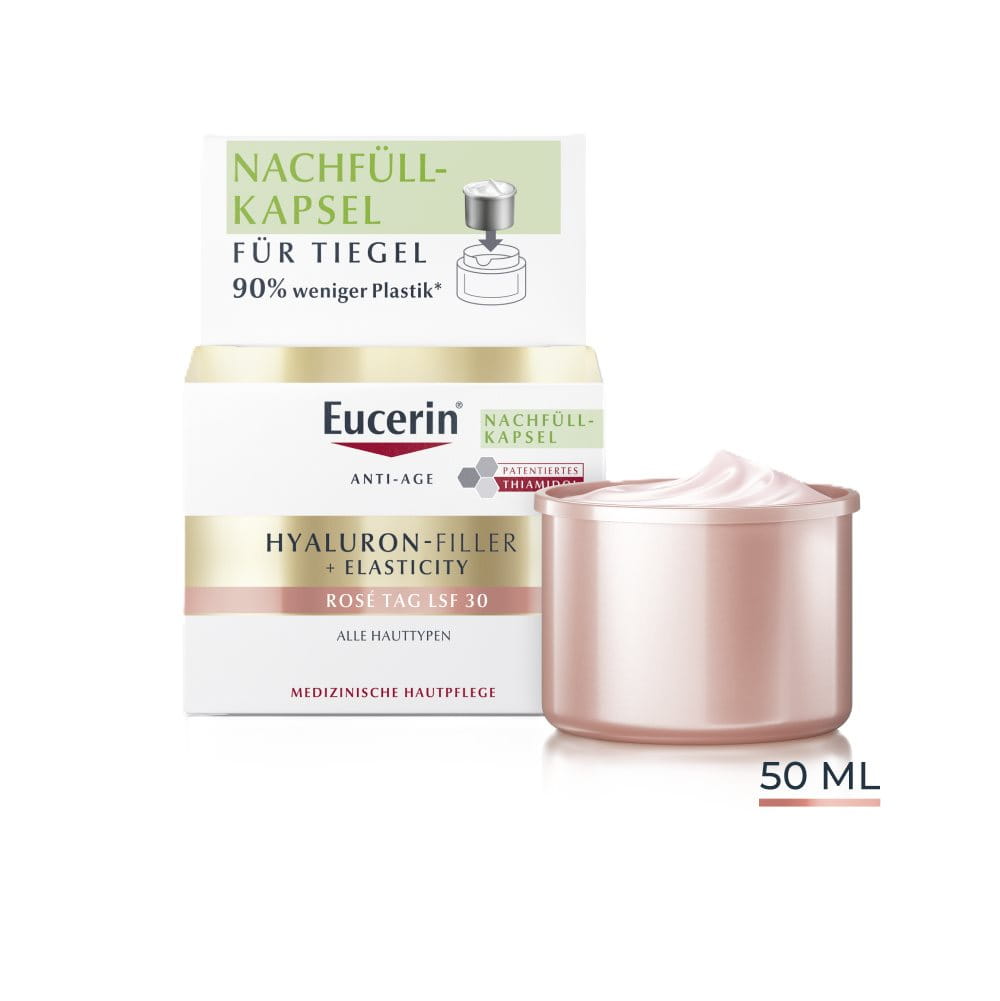 Der HYALURON-FILLER + ELASTICITY Tagescreme Rose SPF 30 Nachfüllkapsel enthält 90 % weniger Plastik als der Eucerin Standardtiegel. Durch die Verwendung der Nachfüllkapsel können Sie helfen, Plastikmüll zu reduzieren und zu einem nachhaltigeren Produktkreislauf beizutragen. Kompatibel mit allen Eucerin Gesichtspflegetiegeln.