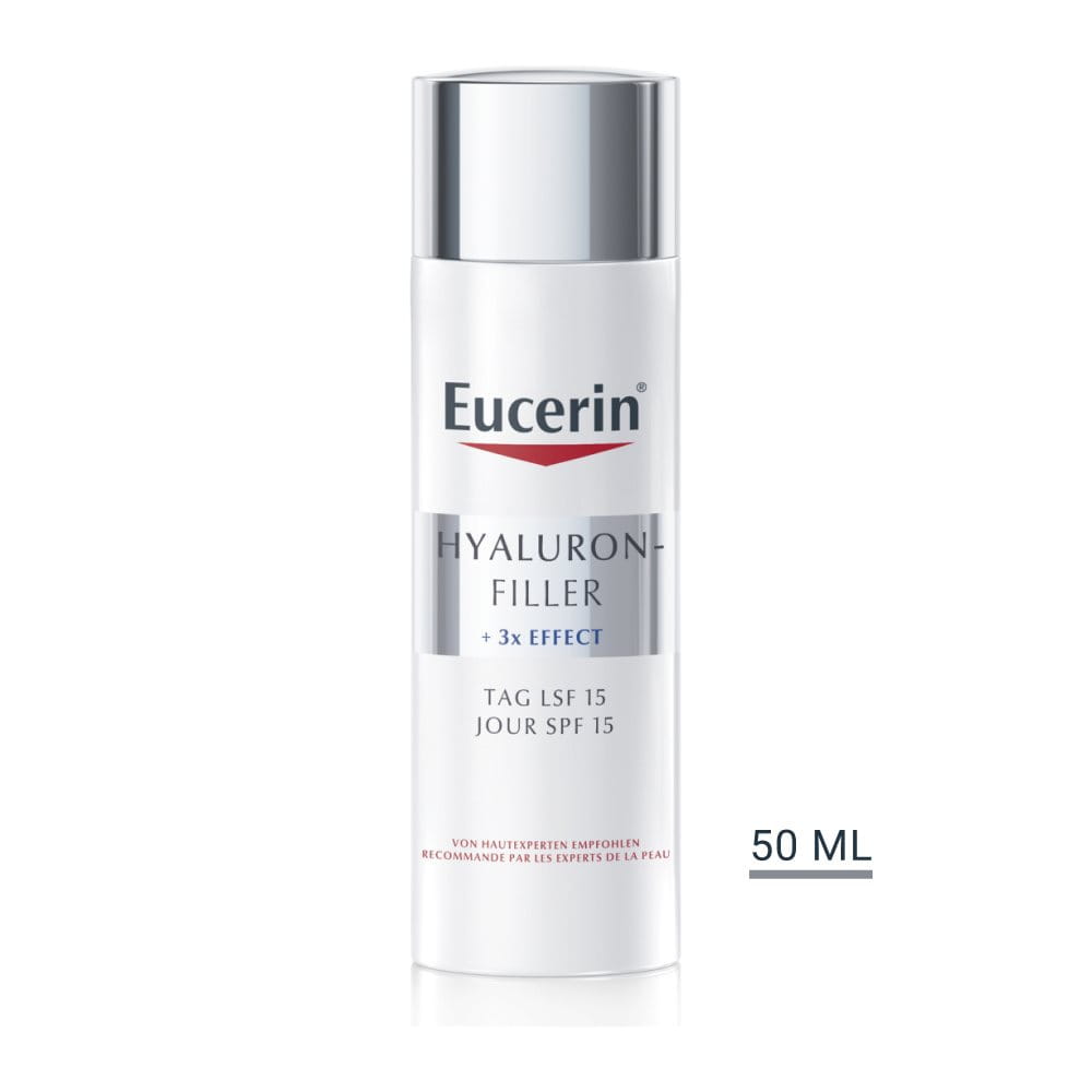 Eucerin Hyaluron-Filler +3x Effect Tagespflege LSF 15 für Normale bis Mischhaut wirkt dem Alterungsprozess der Haut entgegen. Sie füllt selbst tiefere Falten auf, festigt sichtbar und spendet der Haut intensive Feuchtigkeit. Mit LSF 15 und einem UVA-Filter schützt sie die Haut vor vorzeitiger lichtbedingter Hautalterung.