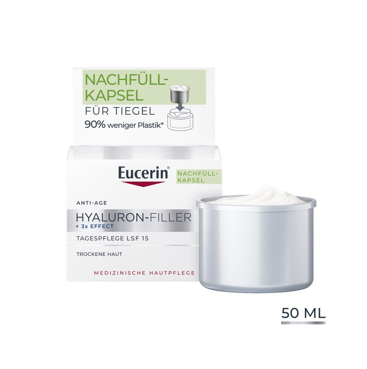 Eucerin Hyaluron-Filler +3x Effect Tagespflege LSF 15 für trockene Haut bekämpft den Alterungsprozess. Sie füllt tiefere Falten, strafft die Haut sichtbar und versorgt sie intensiv mit Feuchtigkeit. Die Nachfüllkapsel enthält 90 % weniger Plastik als der reguläre Hyaluron-Filler-Tiegel. Mit LSF 15 und einem UVA-Filter schützt es die Haut vor frühzeitiger Hautalterung durch Sonnenschäden.