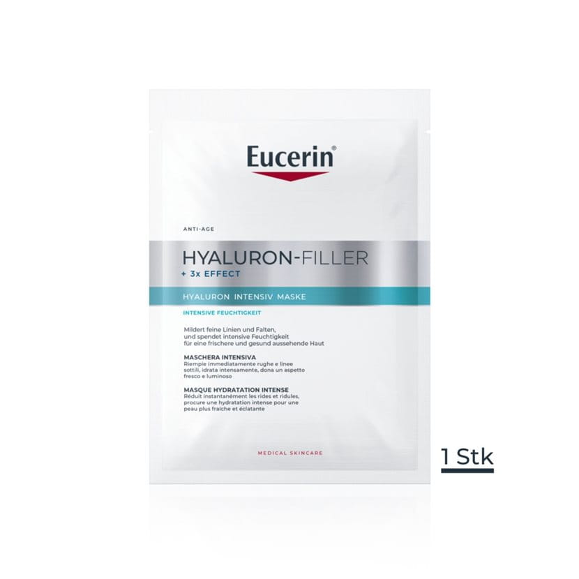 In nur 5 Minuten versorgt diese Gesichtsmaske die Haut intensiv mit Feuchtigkeit und hilft, feine Linien und Fältchen zu reduzieren. Hyaluron-Filler Hyaluron-Intensiv-Maske ist mit der Eucerin-Mischung aus hoch- und niedermolekularer Hyaluronsäure angereichert. Die hochmolekulare Hyaluronsäure verbessert die Hydratation und glättet feine Linien in den äussersten Hautschichten, während die niedermolekulare Hyaluronsäure, die 40-mal kleiner ist, tiefer in die epidermalen Hautschichten eindringt, wo tiefere Falten ihren Ursprung haben.
