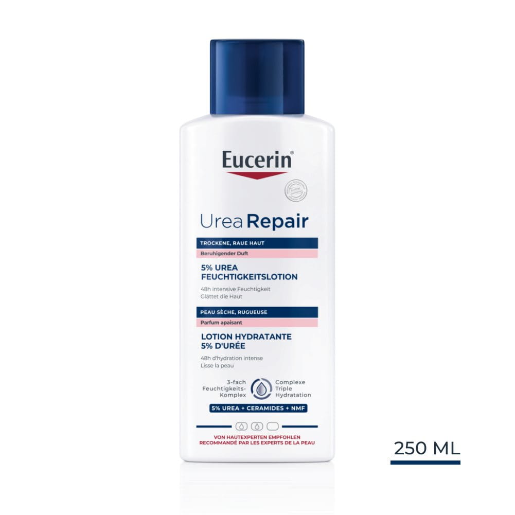 Die Eucerin UreaRepair 5% Urea Feuchtigkeitslotion (beruhigender Duft) gibt trockener, rauer Haut die tägliche Pflege, die sie braucht. Sie beinhaltet eine einzigartige Formulierung mit dreifach Feuchtigkeitskomplex für eine sofortige Linderung der Anzeichen trockener Haut: Rauheit, Juckreiz und Spannungsgefühle: